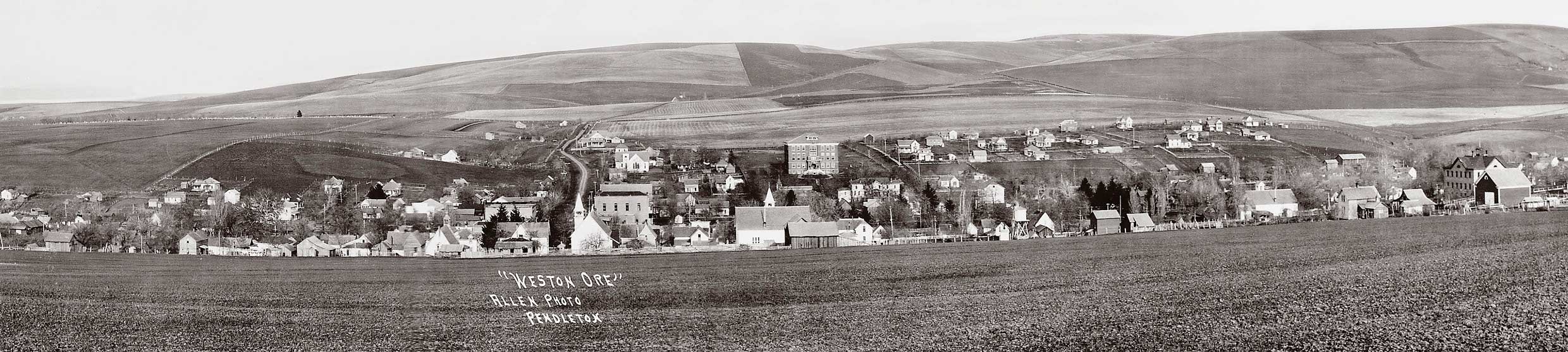 Clearly visible is the Weston Cemetery with its lone fir tree on the hillside to the left and above town,
