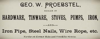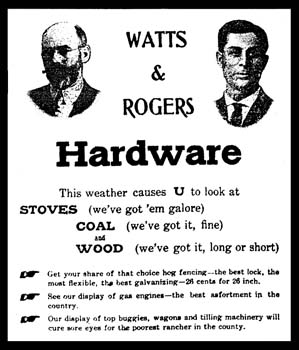 The brick structure at the Northeast corner of Franklin and Main was built around 1874 by Isham Saling, and known as the Saling Building. It housed the Saling & Reese Store, and survived the fires of 1875 and 1883. By 1890, George Proebstel had established a hardware-farm implement-lumber store there, which was later bought out by Dr. FD Watts and EC Rogers; and then around 1920, purchased by the Jones Bros who offered the same goods and services. In more recent years it housed the Elliott Dry Goods & Hardware.