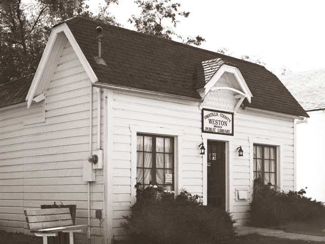 In 1912, Mrs Norah Watts, wife of Dr. Watts, and Mrs. George Proebstel, wife of ex-Senator Proebstel, circulated a petition for a small tax levy to finance a public library in Weston. The levy passed , and the county librarian helped in the library's organization. A tea was given, with admission being one book. Eliza Morrison was the first librarian. Locations varied over the years. Doris Barnes and Mrs. Jim Stanfield were paid librarians while it was housed in the Normal School dormitory. From there , the location moved to Dr. Watts' office on Water Street before the building was moved to its present location on Main Street. The library was enlarged in 1933, and the grounds were lanscaped. In 1955, Margaret Sutherland became the librarian, serving in that capacity for 40 years. She compiled the extensive local history collection, including the current historic photo archive. A Meyer Trust grant in 1995 provided for another expansion of the library, including a deck overlooking Pine Creek. Margaret retired in 1995, with Kathleen Schmidtgall taking over the helm to expand operations into the digital age, and continue with enhancing and expanding the photo archive.