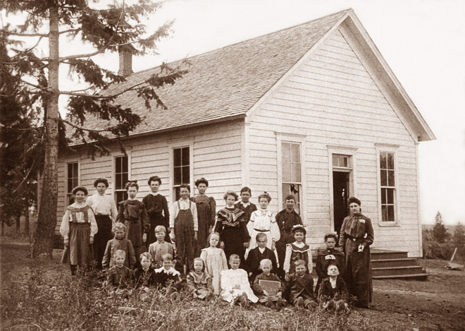 Basket Mountain School, teacher, and students