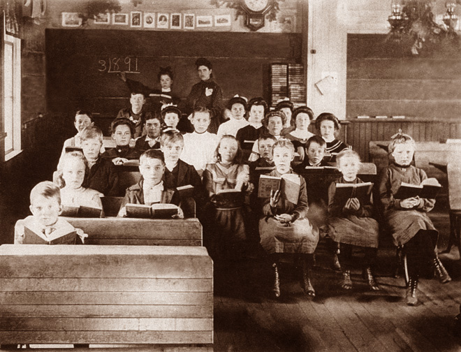 Basket Mountain School Classroom, teacher, and students